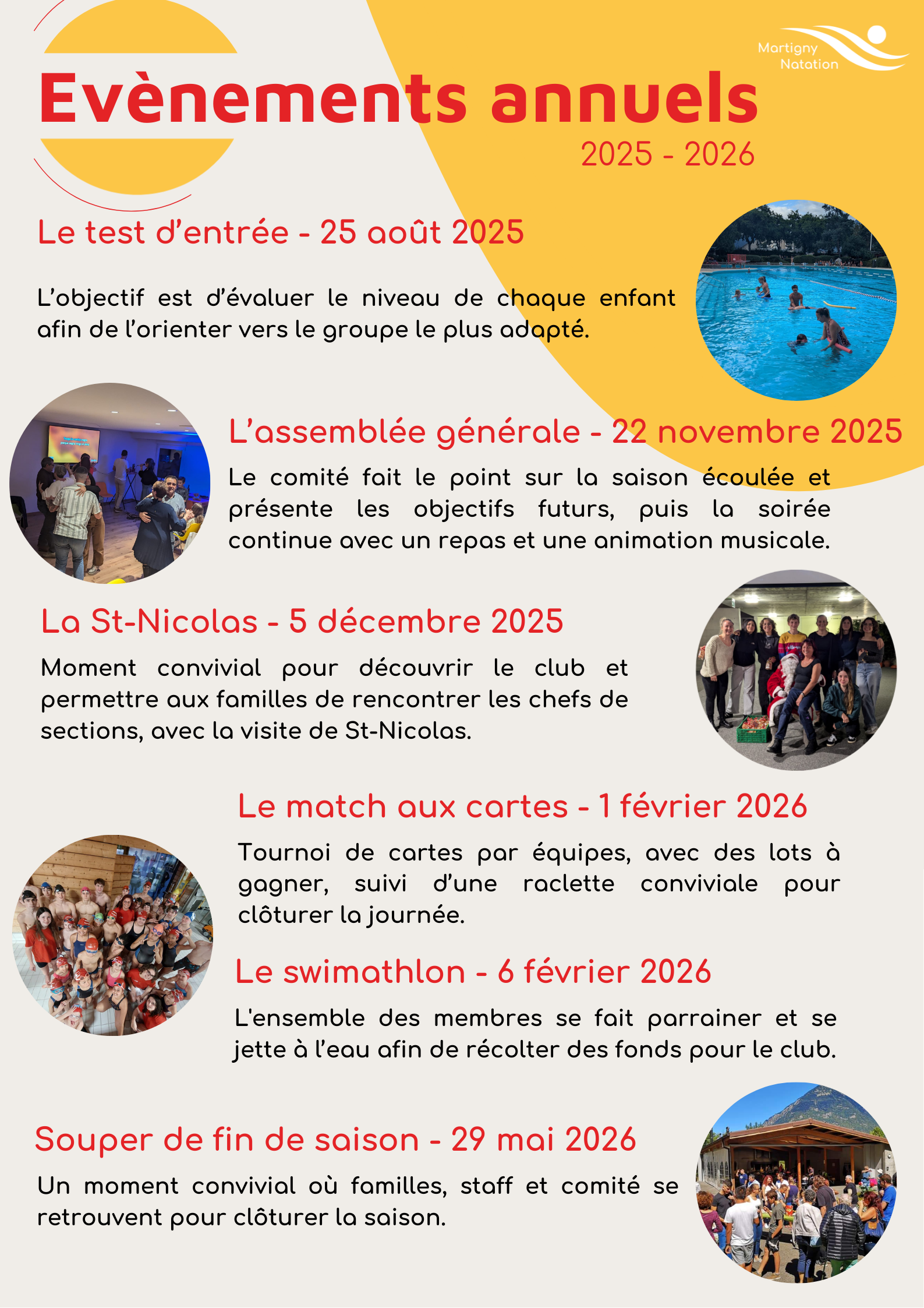 • Avant les vacances de Carnaval, nous organisons notre Swimmathlon. L'objectif de cet événement est de récolter des fonds pour des projets du club. Les nageurs se font parrainer et l'événement est suivi d'un apéro.